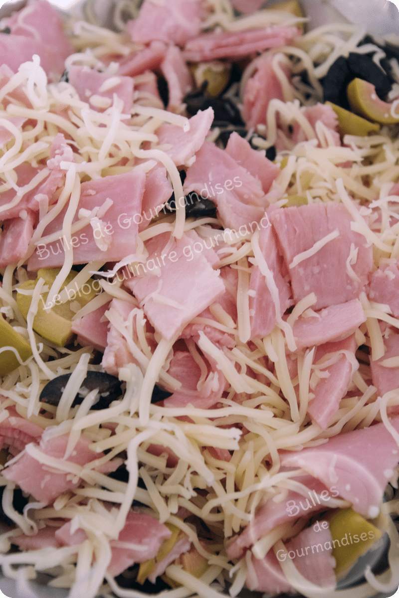 Coupez les olives en quatre et vos tranches de jambon en petits morceaux, pour nous des carrés. Ajoutez le gruyère et mélangez. Réservez au frais.