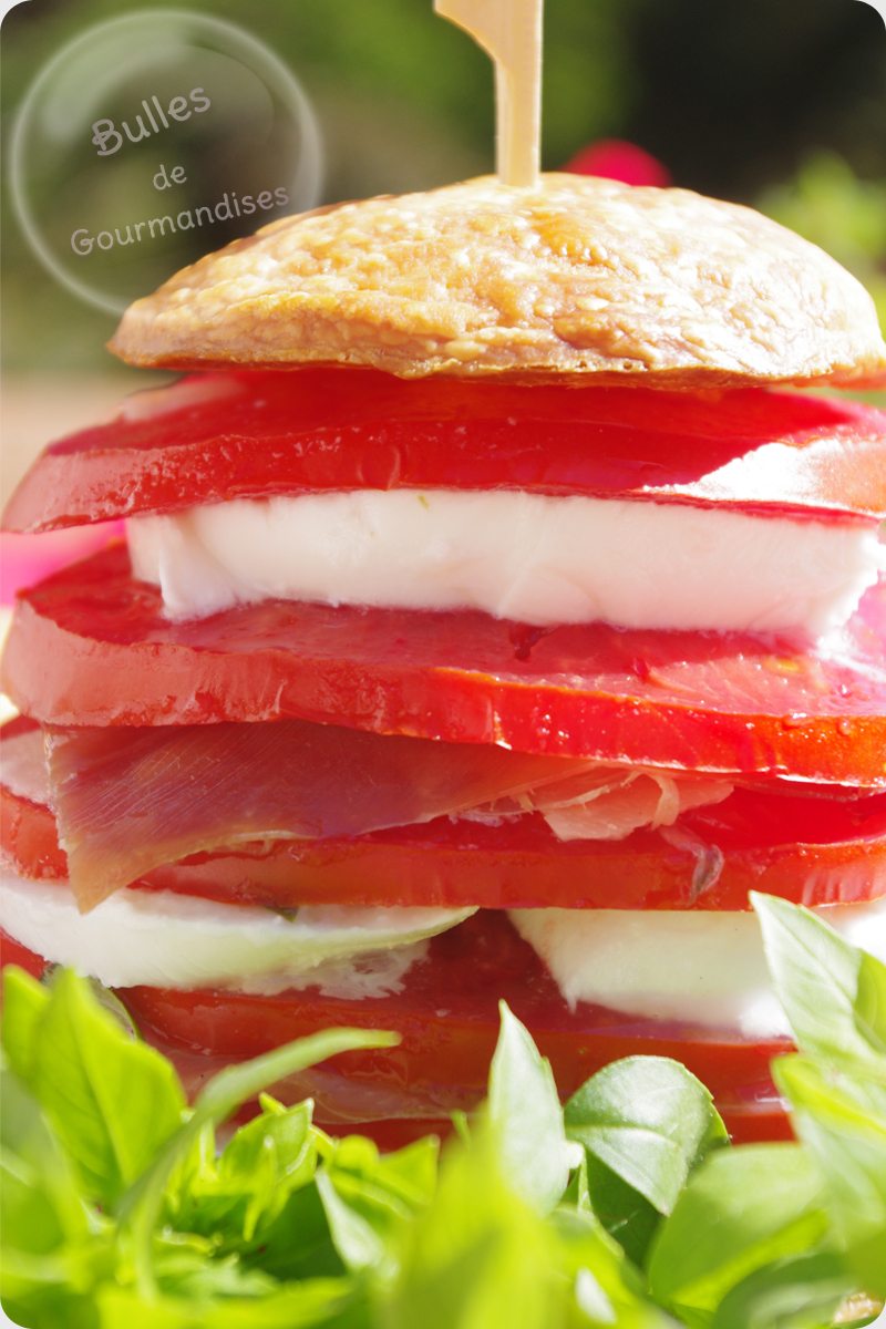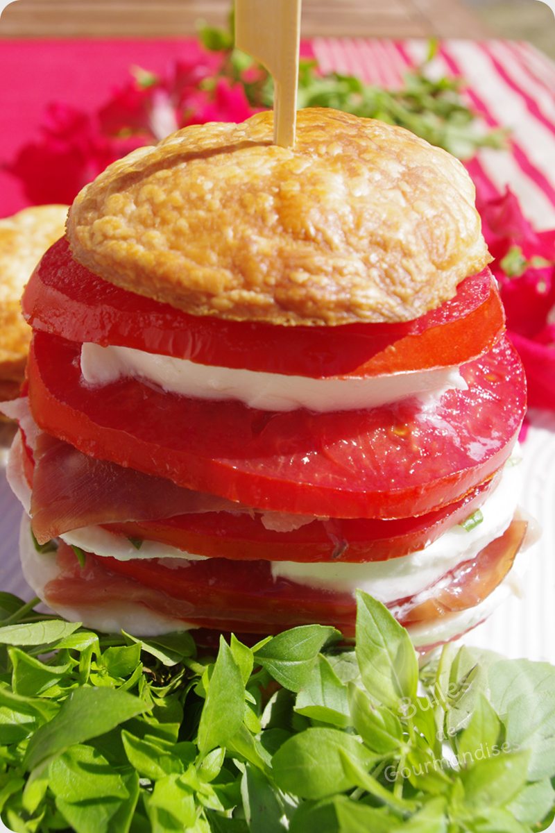 Un petit disque de pâte feuilletée, une tranche de tomate, du parmesan, des lanières de jambon, une tranche de tomate, de la mozzarella, du basilic puis à nouveau tomate, parmesan, jambon et ainsi de suite… pour terminer un filet d’huile d’olive et un nouveau disque de pâte feuilletée.